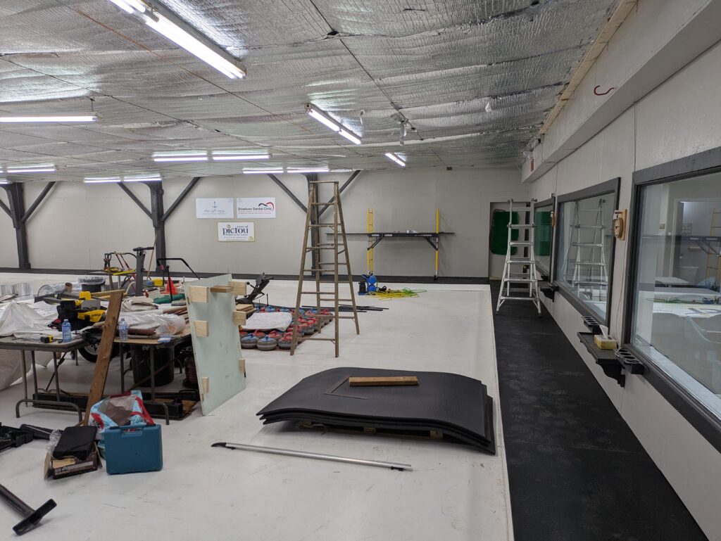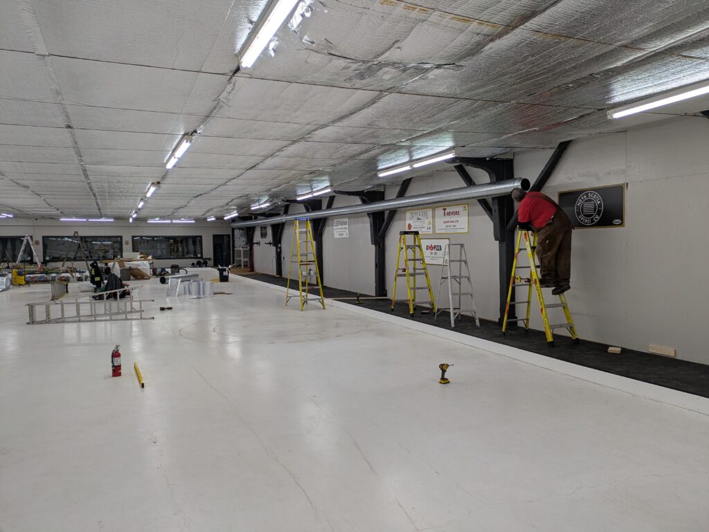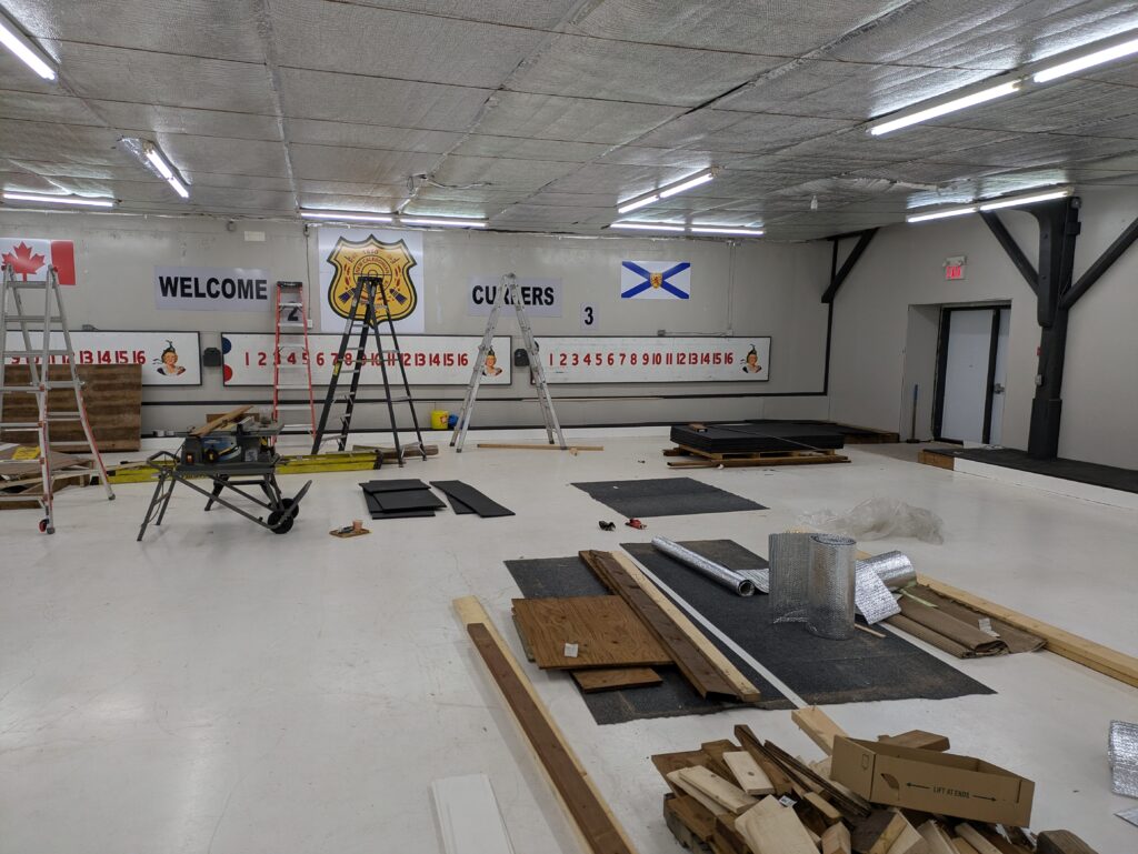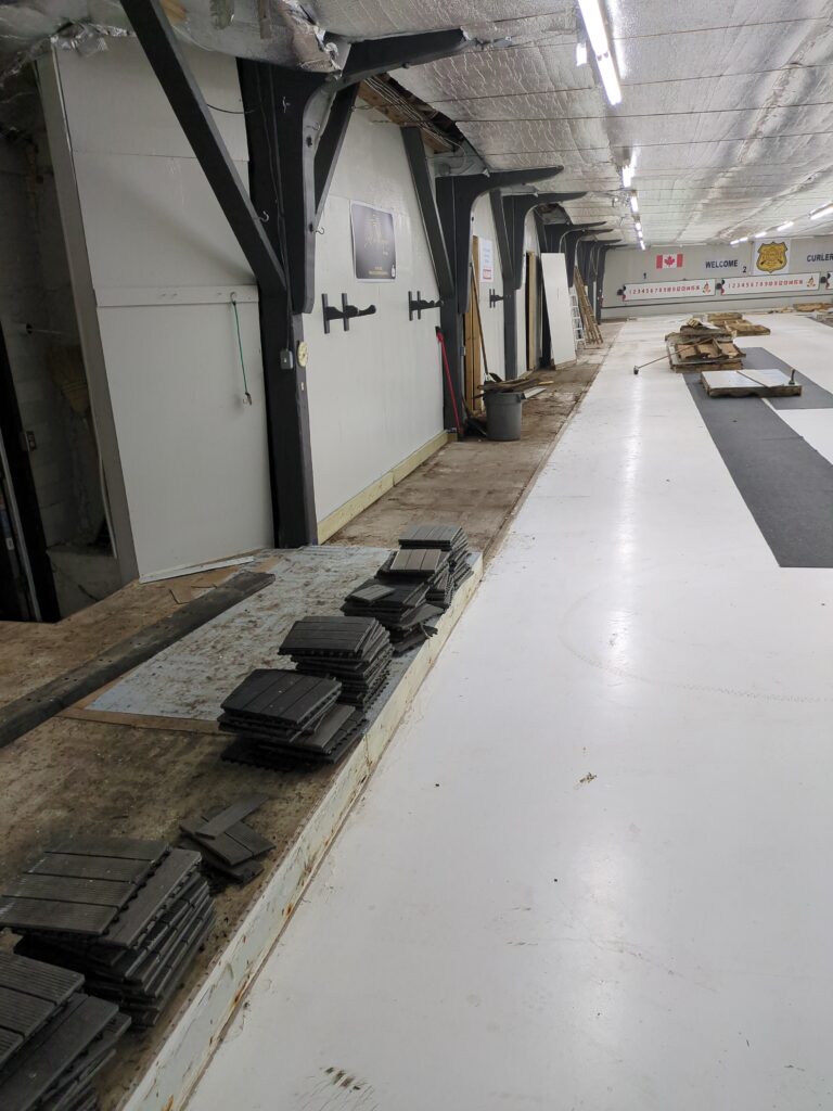 The club has undertaken a number of renovations this Fall in the ice shed prior to the start of the ’25-’26 season. The majority of the old walkway has been torn out and replaced with a new, pressure-treated walkway. The old carpet is being replaced with rubber horse stable mats around the entire walkway – this should improve traction throughout.