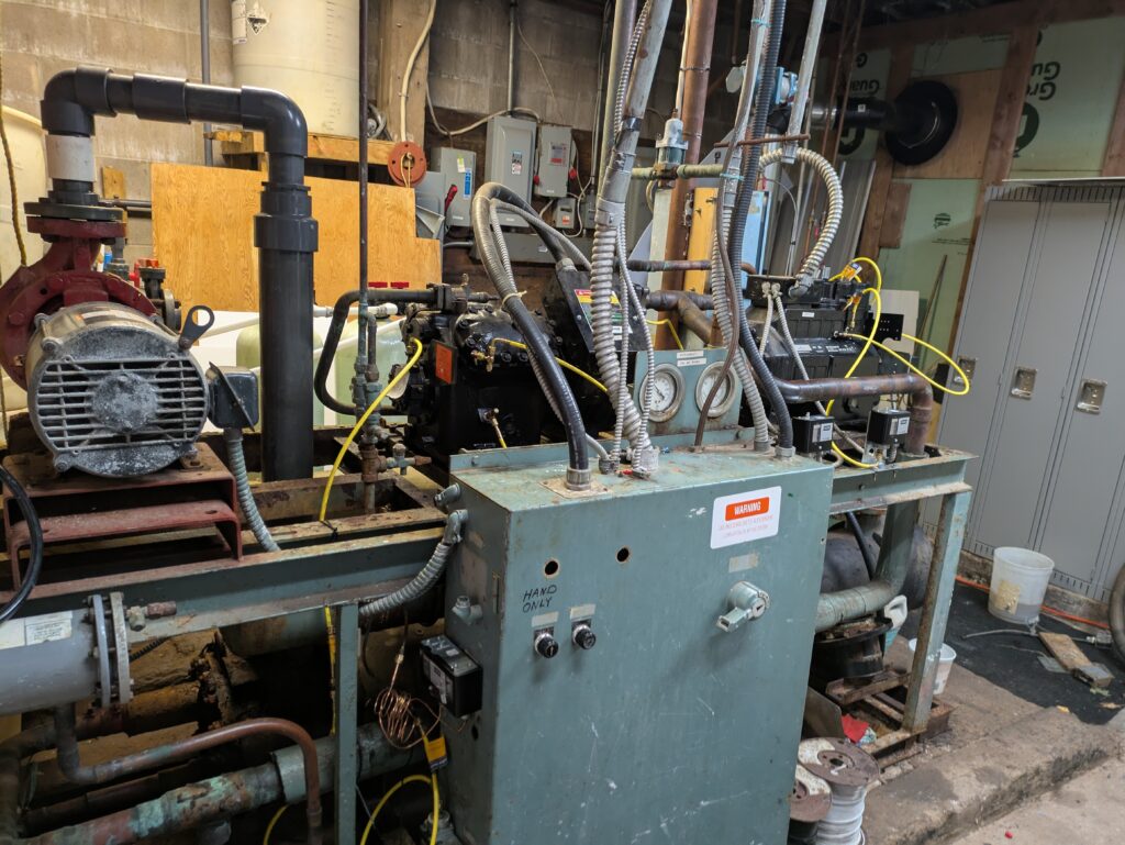 The final two areas of work are in the plant room: there’s been a tremendous amount of work done on the plant room roof to keep the rain & melting snow from falling dropping down the necks of the ice crew AND there’s a long-needed fix the plant’s control system underway to provide better temperature control and to help reduce the cost of running the plant.